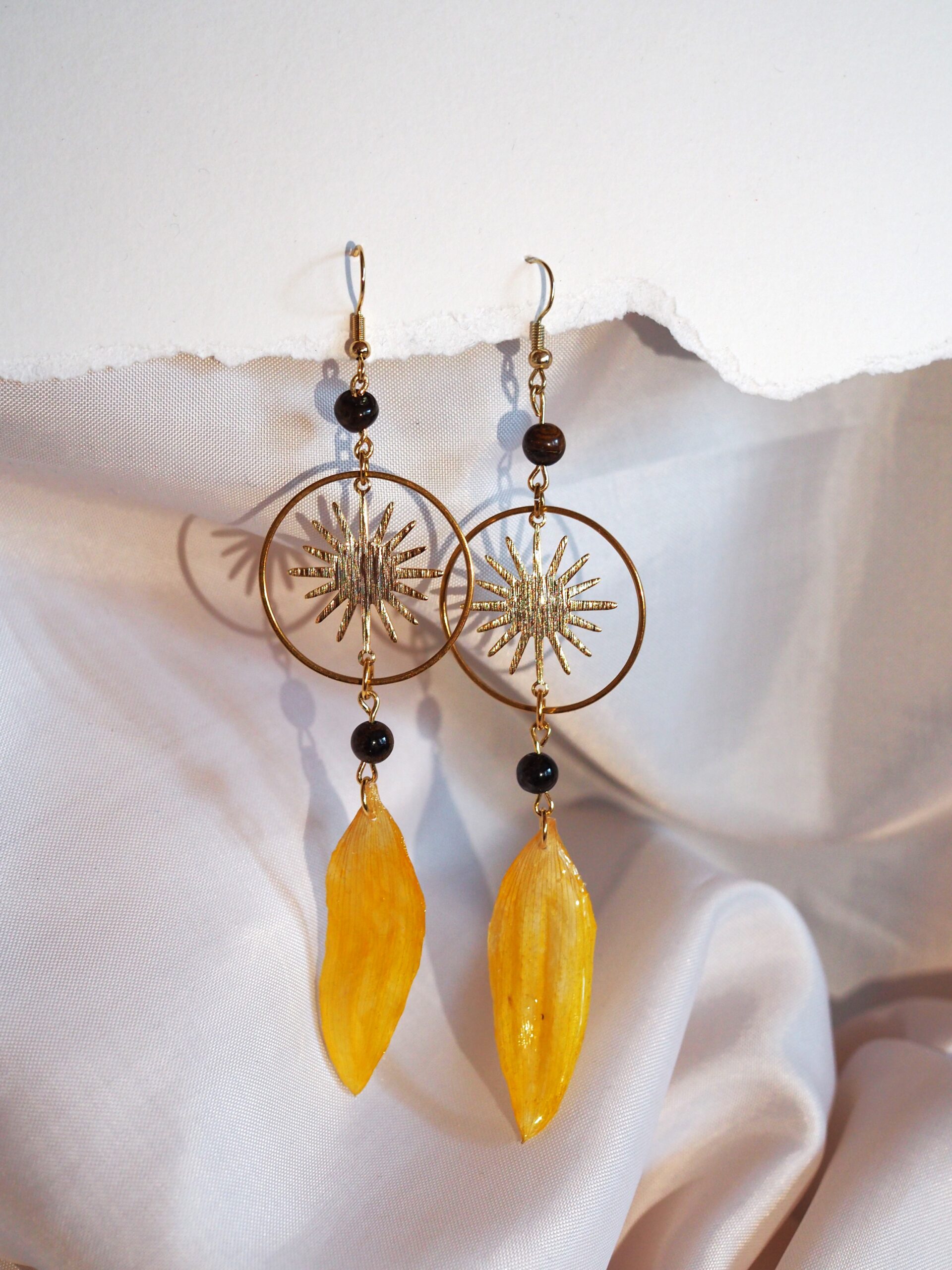 Aidot auringonkukan terälehdet, UV-hartsi, Ruostumaton teräs + 18/25k kullaus, tiikerinsilmä-kivihelmi.